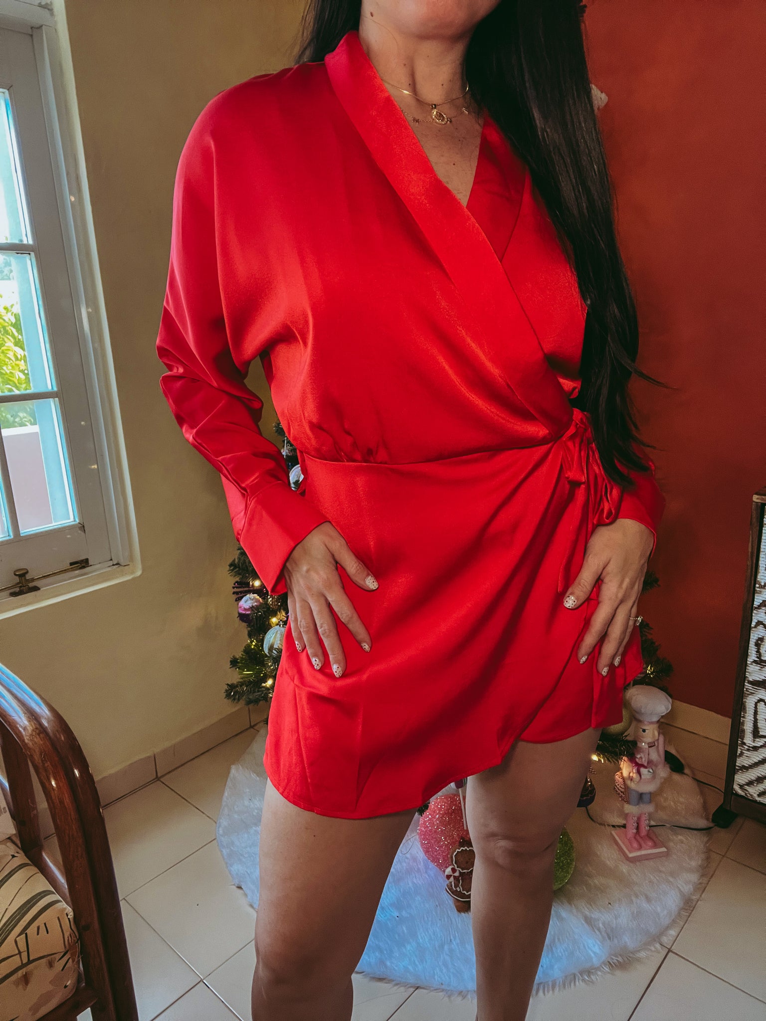 Romper satinado en tono rojo navideño con diseño tipo kimono wrap around.