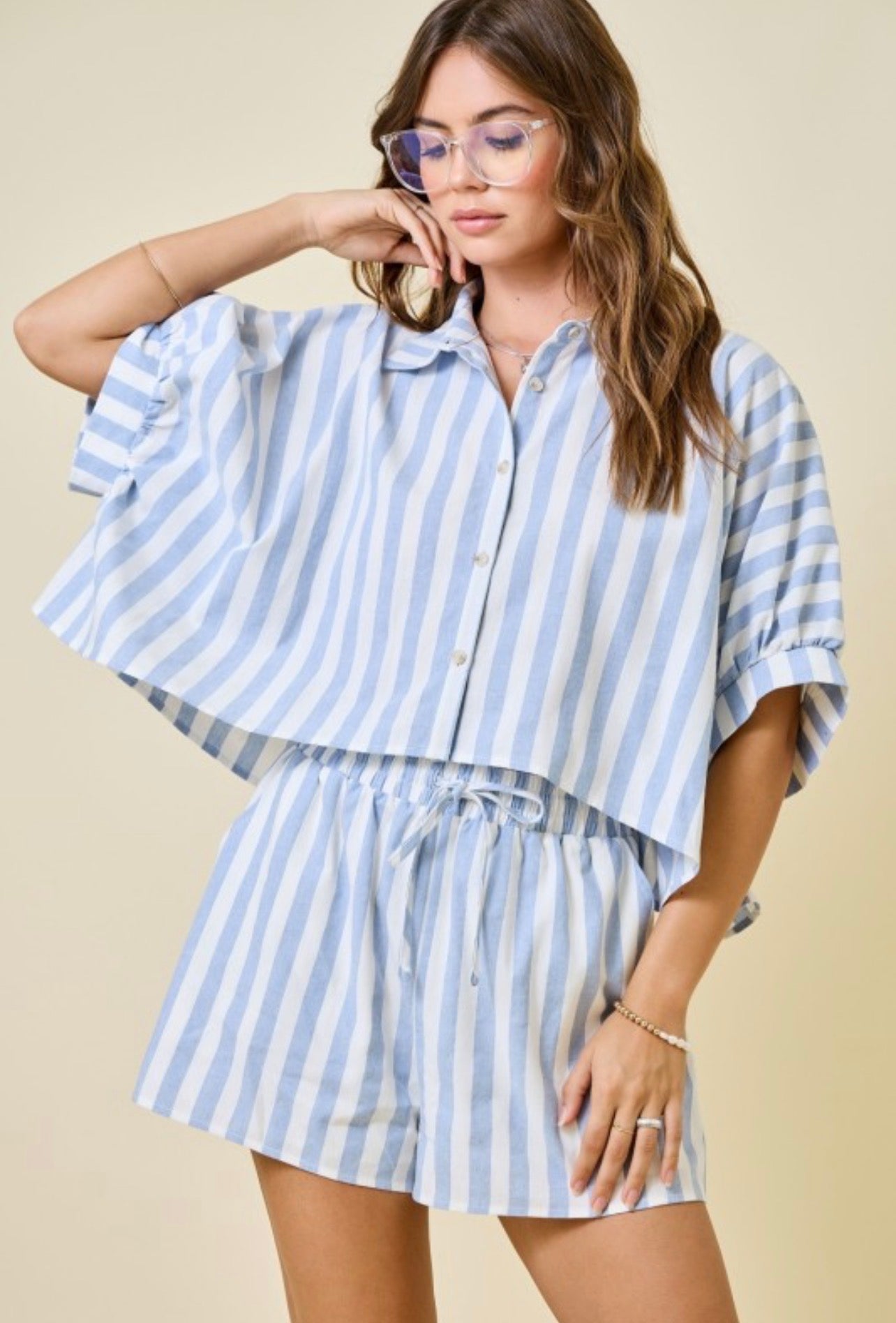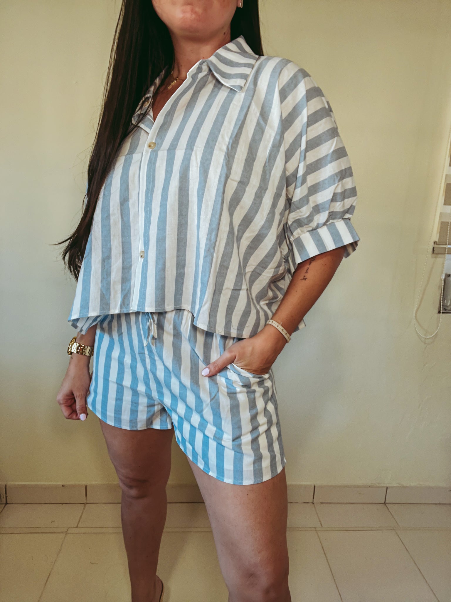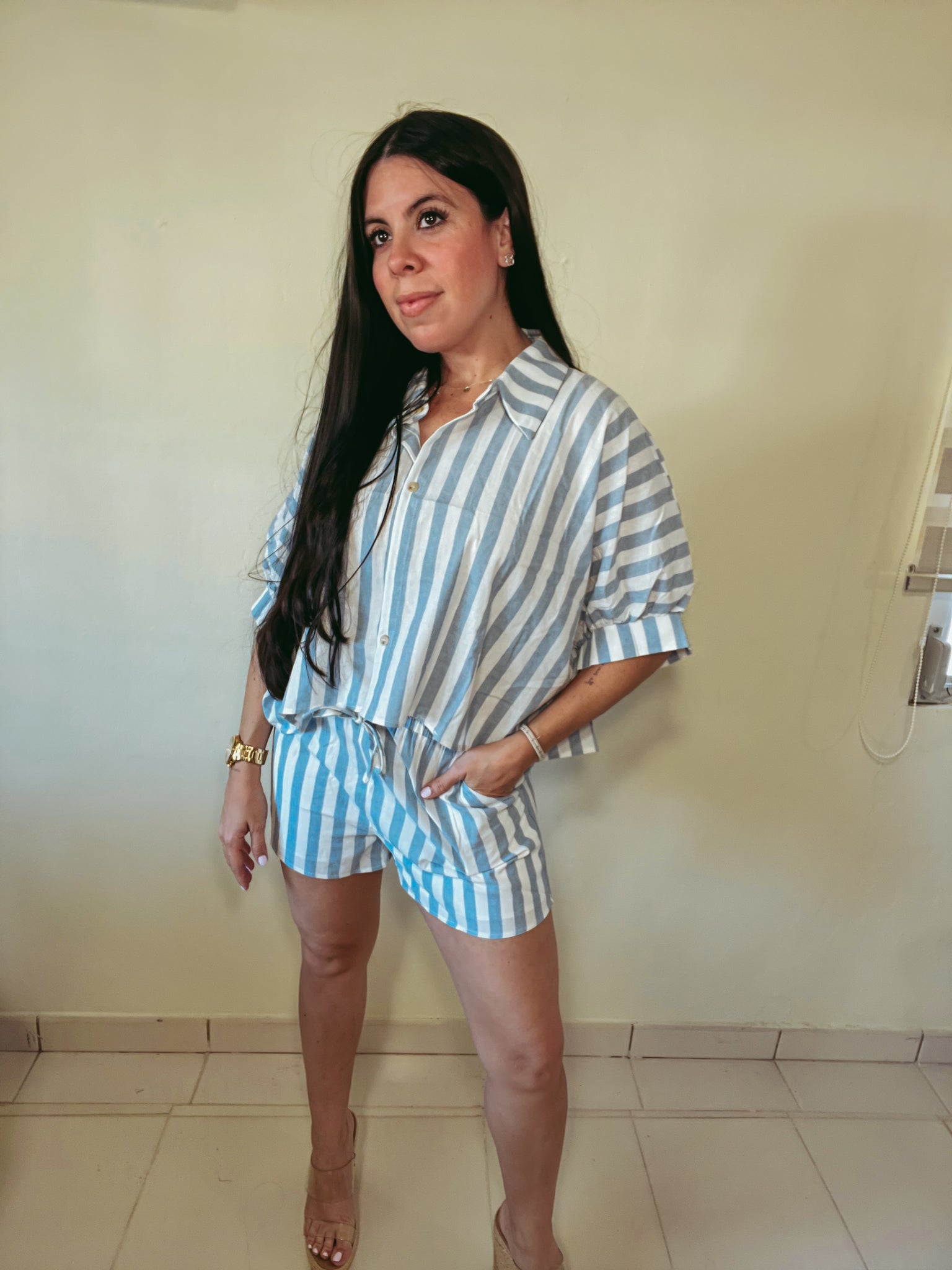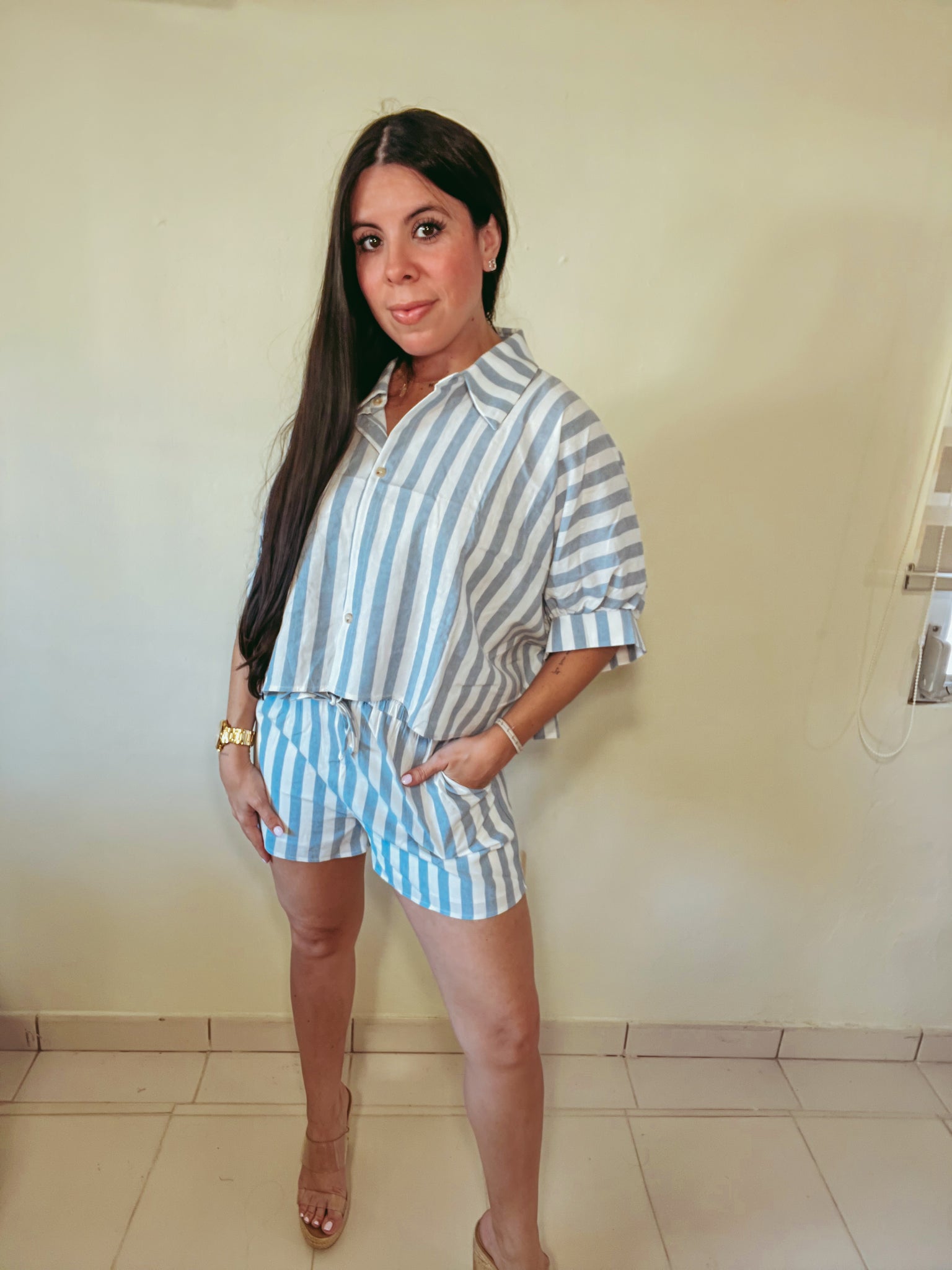 Este two-piece set de líneas baby blue y blanco es ese outfit que te resuelve en segundos. El short cuenta con bolsillos y cintura elástica para máxima comodidad, y el top de botones con mangas tipo burbuja le da un toque femenino y especial.