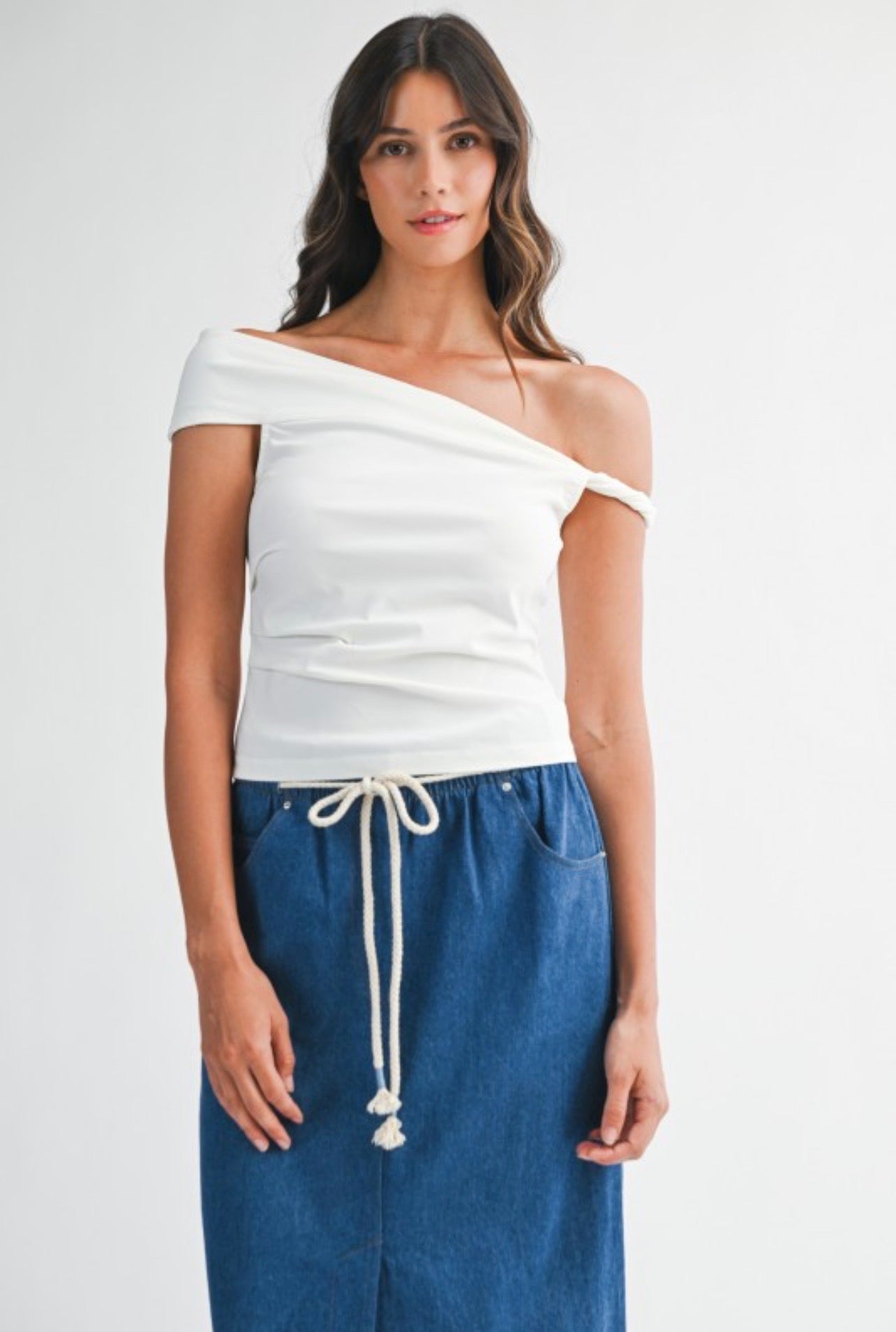 Top básico blanco asimétrico, versátil y fácil de combinar. La pieza perfecta que te resuelve cualquier look, ideal para usar con mahones o pantalones de vestir, tanto para el trabajo como para cualquier salida.