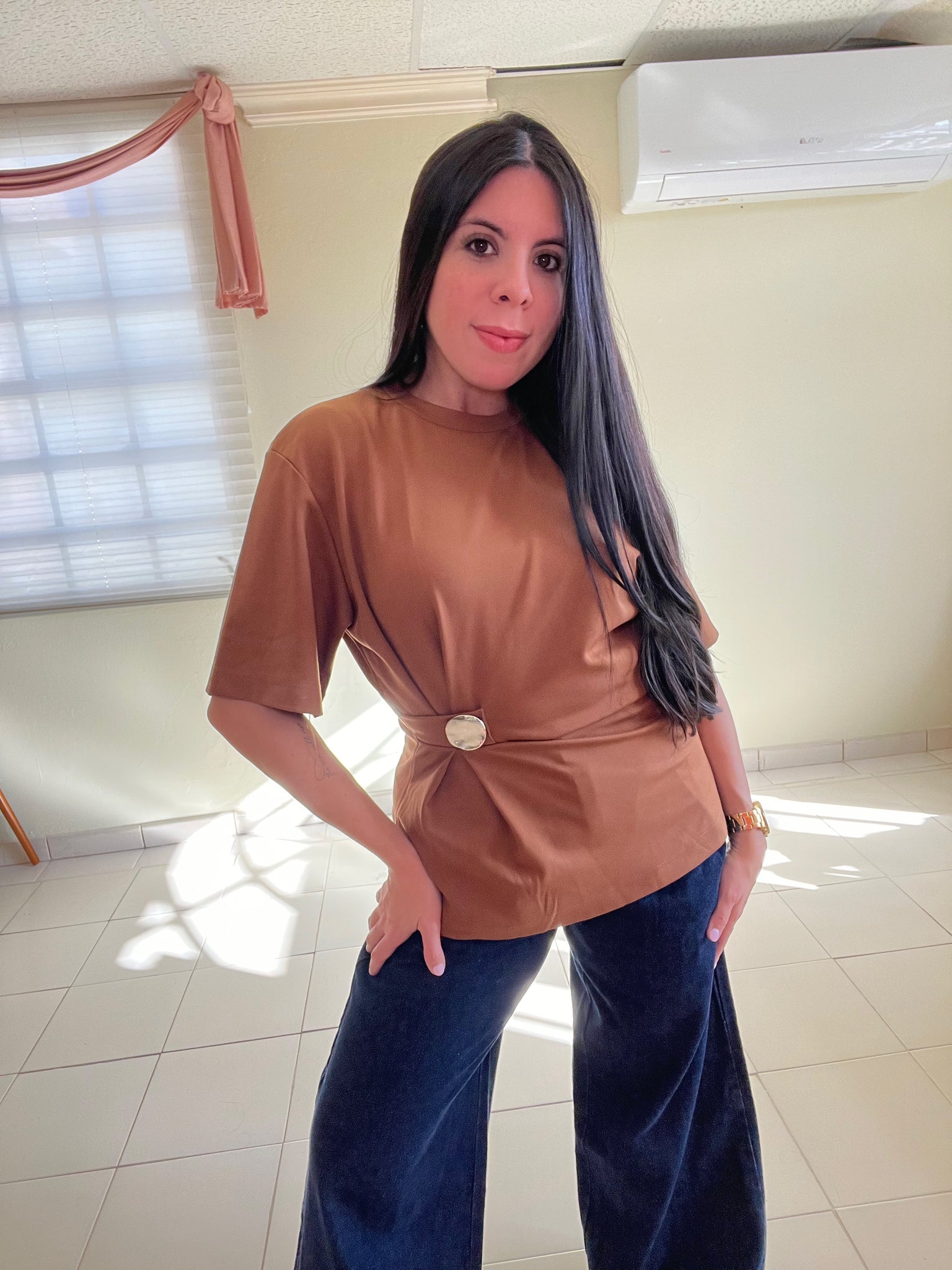 Blusa color marrón con detalle metálico en la cintura, ideal para un look elegante pero casual.